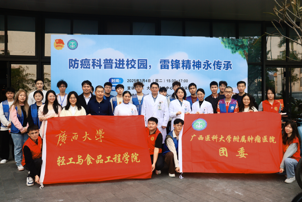 为深入贯彻落实《“健康中国2030”规划纲要》的重要精神,进一步提高师生健康知识素养和自我保护意识,3月4日下午,成人动漫 、新闻与传播学院团委联合广西医科大学附属肿瘤医院团委,在大学生活动中心开展“防癌科普进校园,雷锋精神永传承”主题公益活动。我校成人动漫 团委书记徐羽、新闻与传播学院团委书记刘梦娟,两院辅导员代表、学生志愿者,以及广西医科大学附属肿瘤医院医护专家代表共同组...