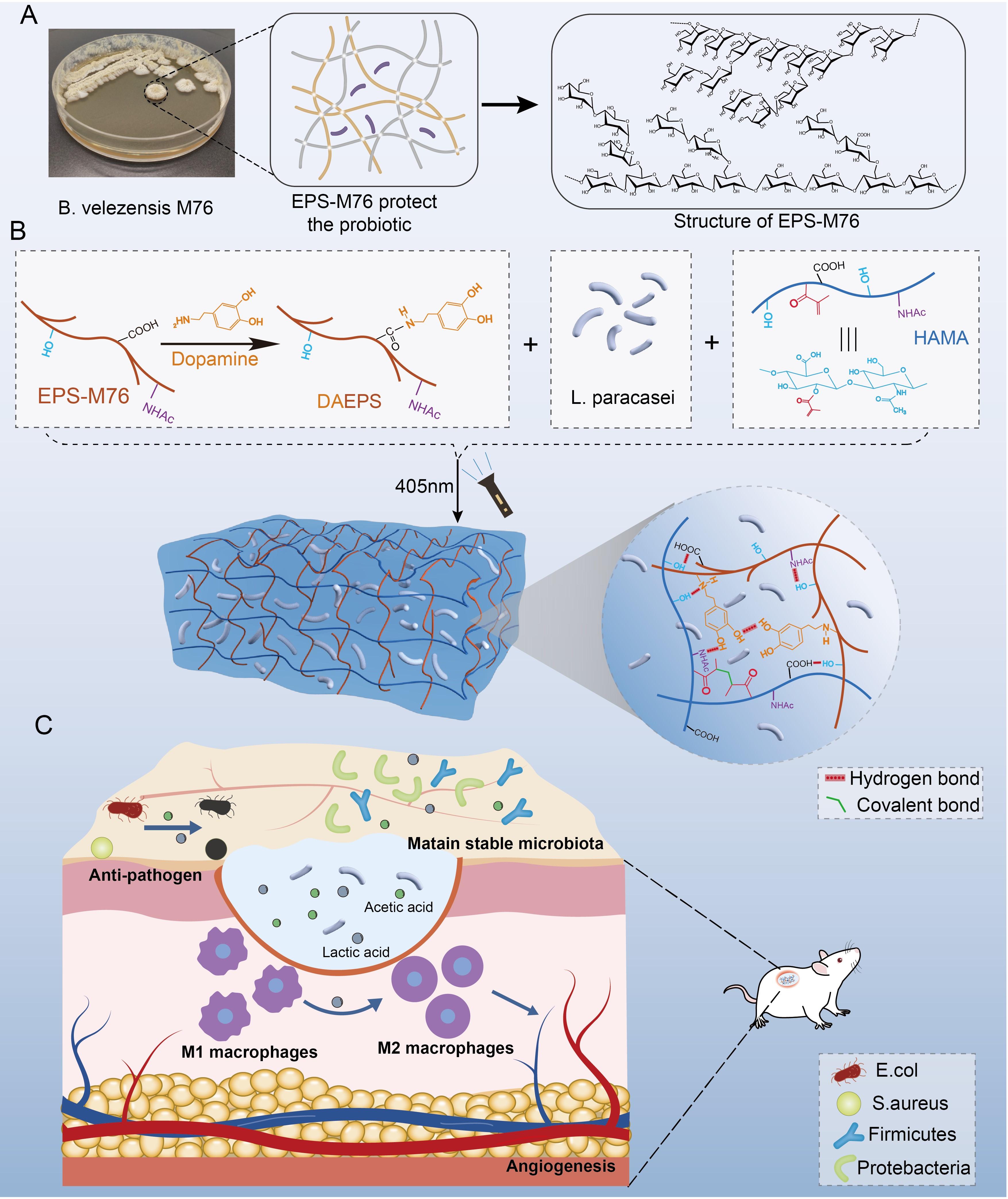 皮肤微生物群在伤口愈合中发挥着重要作用,传统的抗菌水凝胶在杀死致病菌的同时不可避免的抑制皮肤益生菌的生长,从而破坏皮肤菌群的平衡。研究团队基于细菌胞外多糖(EPS),设计了一种既能抵御致病菌又能保持皮肤菌群稳定的活益生菌水凝胶。包埋在水凝胶中的副干酪乳杆菌(Lactobacillus paracasei TYM202)具有促进伤口愈合的活性,而水凝胶基质 EPS-M76具有益生元活性,可促进副干酪乳杆菌的增殖和新陈代谢。此外,该水凝胶可降低伤口愈合过程中的炎症发生率,同时促进血管生成,增加胶原蛋白沉积。该论文得到华南理工大学食品科学与工程学院万芝力教授的大力支持。成人动漫