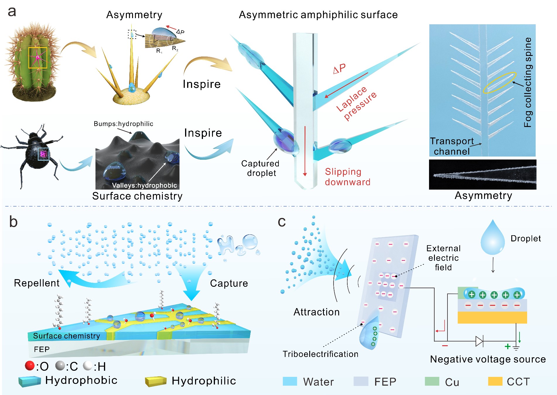 轻工技术与工程专业2021级博士生张松等人从仙人掌刺和甲虫翅翘结构获得灵感,构造了双重仿生结构以实现液滴快速凝结和去除。首次揭示了水收集表面与液滴之间的界面电荷相互作用,并将其应用于大气水收集,实现了前所未有的极高水收集效率。相关研究成果于2022年7月18日以题为“Bioinspired asymmetric amphiphilic surface for triboelectric enhanced efficient water harvesting”在线发表于《Nature Communications》。论文链接//doi-org-s.vpn.cranime1.com:8118/10.1038/s41467-022-31987-w