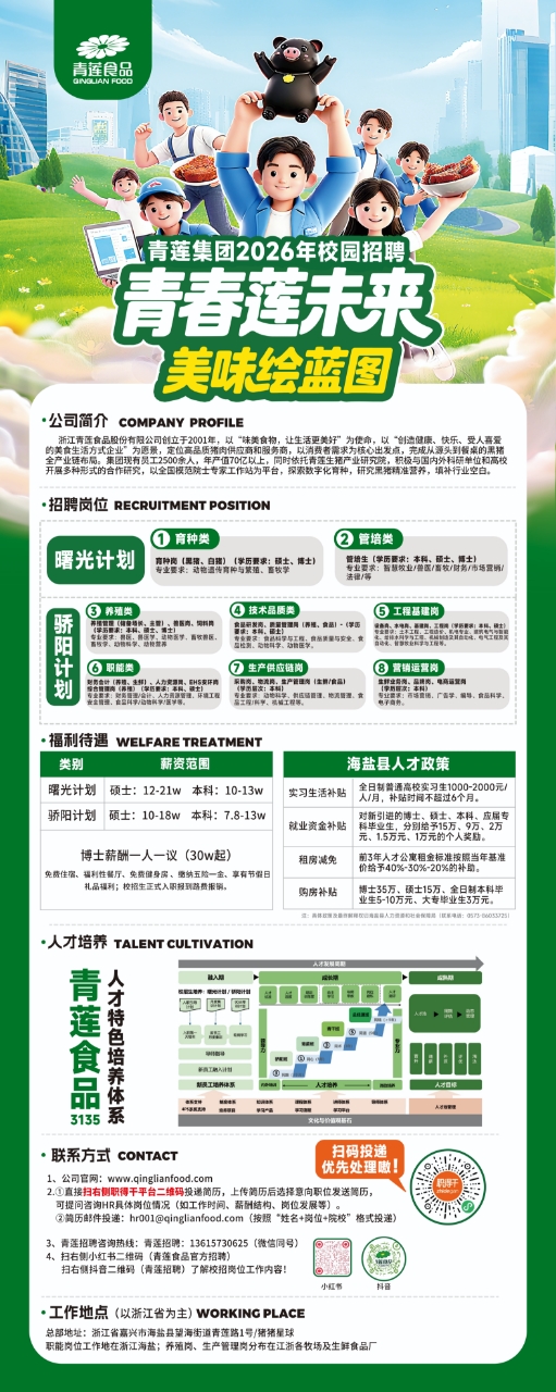 亲爱的同学们,青莲食品将于10月17日(周五)下午15:00在动物科学技术学院318报告厅举办成人动漫 专场招聘宣讲会,本次招聘聚焦食品质量工程师、品控、研发、育种、兽医、机械工程师、人事、财务、生产和市场等岗位,具体信息见招聘简章,线下投递简历优先筛选!宣讲会现场更有各种零食试吃和礼品赠送!