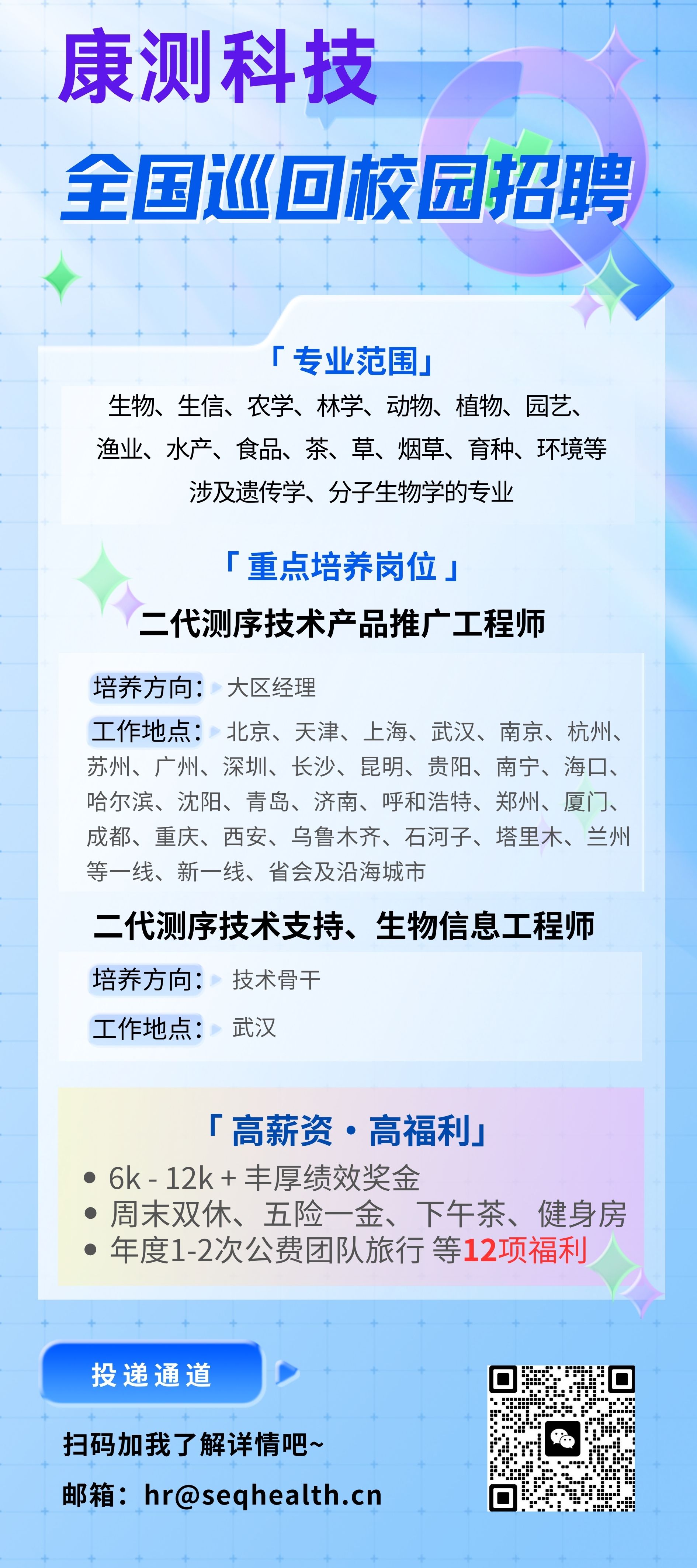 康测科技校园招聘(全国巡回)宣讲会(内附资深HR揭秘实操就业tips) (qq.com) 宣讲时间:2024.10.14/15:00宣讲地点:成人动漫 农学院306教室线上投递渠道:[email protected] 我们在这里等你加入!农学院、林学院、理学院、生物、分子生物、遗传、植保、动医、动科、园艺、基因相关院系及专业都可投递。