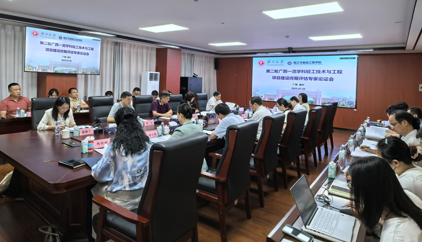 7月5日,我校召开第二轮广西一流学科轻工技术与工程建设终期评估专家论证会。会议特邀由国务院学位委员会学科评议组秘书长、教育部高等学校轻工类专业教学指导委员会副主任、陕西科技大学王学川教授,国务院学位委员会学科评议组成员、天津科技大学副校长王敏教授,国务院学位委员会学科评议组成员、四川大学廖学品教授,教育部高等学校轻工类专业教学指导委员会委员、齐鲁工业大学(山东省科学院)党委副书记刘玉教授,教育部高等学校轻工类专业教学指导委员会委员、福建农林大学陈礼辉教授,教育部高等学校轻工类专业教学指导委员会委员、大连工业大学平清伟教授,华南理工大学轻工科学与工程学院院长彭新文教授等七位轻工领域权威专家组成的评估组,对学科建设成效进行了全面的评审。校党委常委、副校长于文进出席会议并致辞。