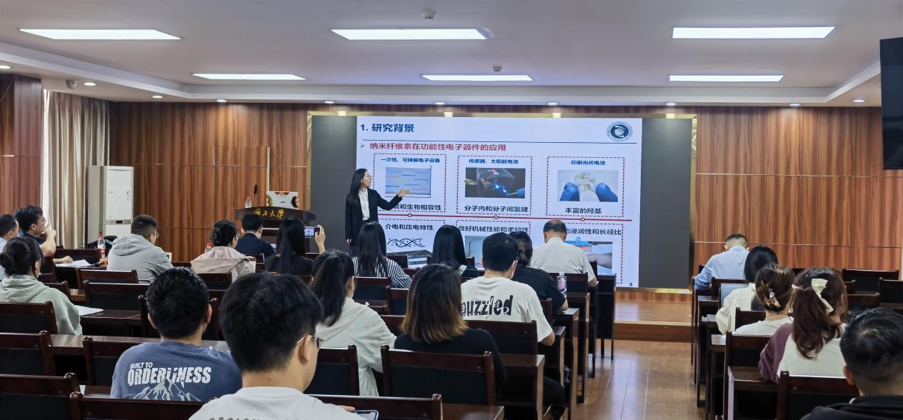 戴林以“木质素基材料构建及应用研究”为主题,与同学们分享了木质素基材料、木质素聚合物复合材料、木质素微纳米材料和木质素凝胶材料,讲述了将柔性电子器件与绿色可回收木质素结合构成液态金属包封体系,最终形成柔性高效可回收电子器件的实验过程。除此以外,戴林还分析了国外木质素智能材料的代表性工作及水热自交联木质素凝胶的合成和应用,他指出:“木质素凝胶成本低,有望成为开发经济、高效堵漏技术的理想原料。”