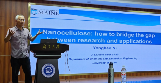 讲座伊始,倪永浩教授以缅因大学化学工程系有关纳米纤维素相关研究及其商业应用作为切入点,从粘度、pH、阴离子电荷等角度介绍了酶选择性断裂半纤维素连接、纤维素网络结构的键合机制等内容,展望了纳米纤维素领域的广阔应用前景,并结合自身丰富的科研经历,分享了在研究方法与思路等方面独到的见解。