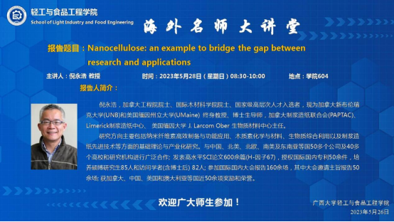 海外名师大讲堂系列讲座在学院604顺利举办。美国缅因州立大学化学生物工程学院教授,加拿大工程院院士倪永浩受邀开展了以“Nanocellulose : an example to bridge the gap between research and applications ”为题的学术报告,报告由覃程荣院长主持。讲座吸引了学院众多老师、研究生、博士生前来聆听。