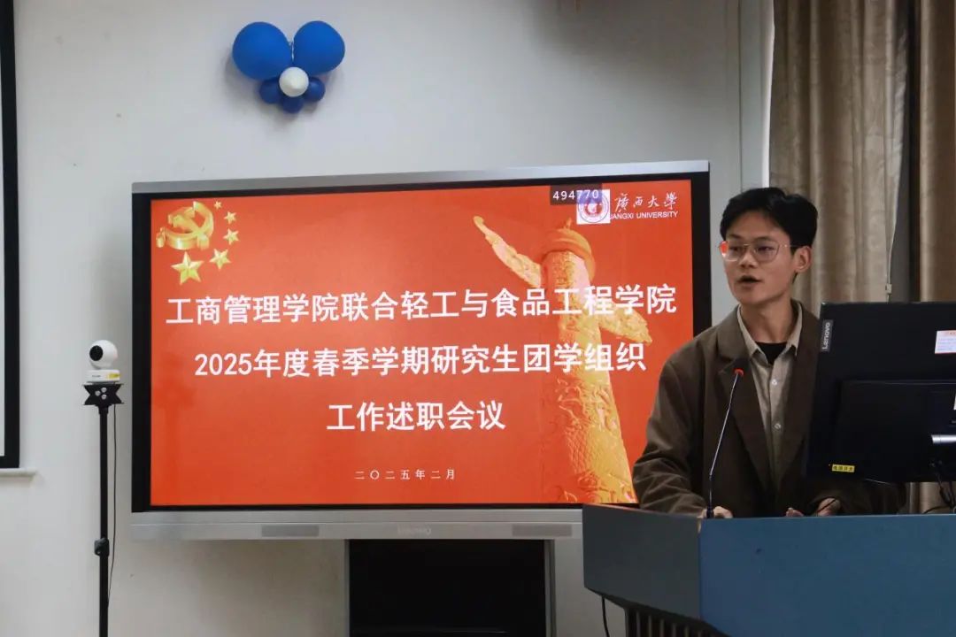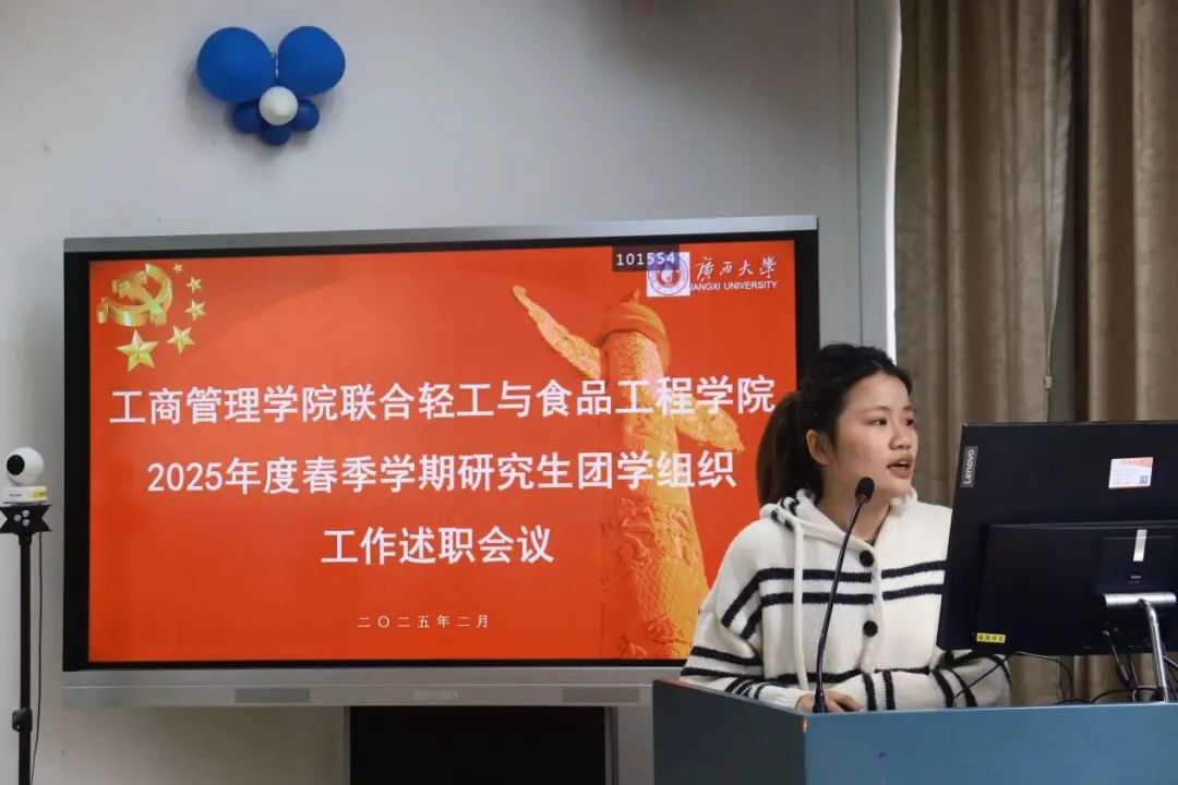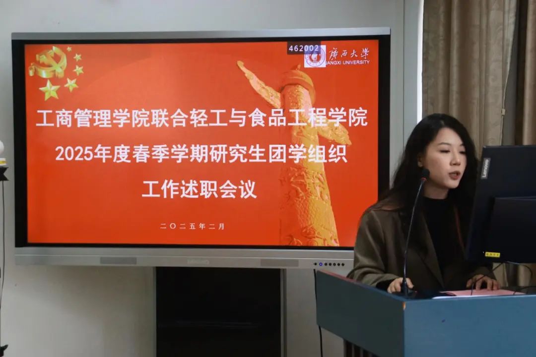 随后,两院研究生团学组织各部门负责人依次述职。工商管理学院党建秘书处、学生团委,以及两院研究生会主席团成员分别汇报工作,涵盖党建、思想引领、团务知识、学术科研、就业服务等方面,以数据和案例总结阶段性成果,并规划未来发展路径。