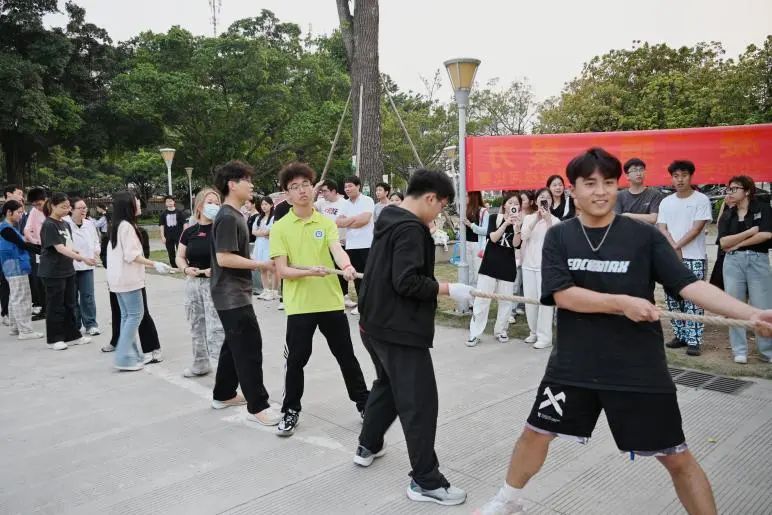 与工商管理学院在西体育馆五号门联合举办“力‘拔’山河,凝‘绳’聚力”主题拔河友谊赛,吸引了众多师生到场观赛助威。