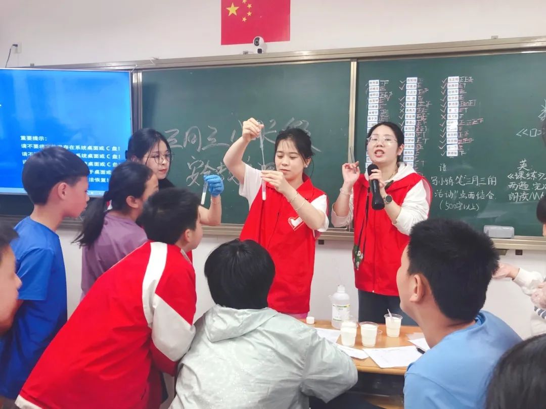 在宣讲中,主讲人巧妙运用知识迁移与情境创设的方法,借助哪吒以莲藕重塑肉身的神话情节,自然流畅地引入对莲藕营养成分的科学实验。在宣讲团讲师卢苇、胡莉的指导下,同学们开展了两项有趣的实验,帮助同学们了解日常食物中的营养成分——淀粉和蛋白质。通过碘液对淀粉的显色反应,探究馒头、西红柿、莲藕以及瘦肉等常见食材中是否含有淀粉。通过观察使用双缩脲试剂对蛋白质的显色反应,直观了解牛奶中蛋白质的特性。这些实践探究活动,充分体现了 “做中讲、讲中思” 的理念,不仅加深了同学们对食物营养结构的科学认知,更极大激发了他们对科学实践的浓厚兴趣,为培养创新思维与实践能力奠定坚实基础。