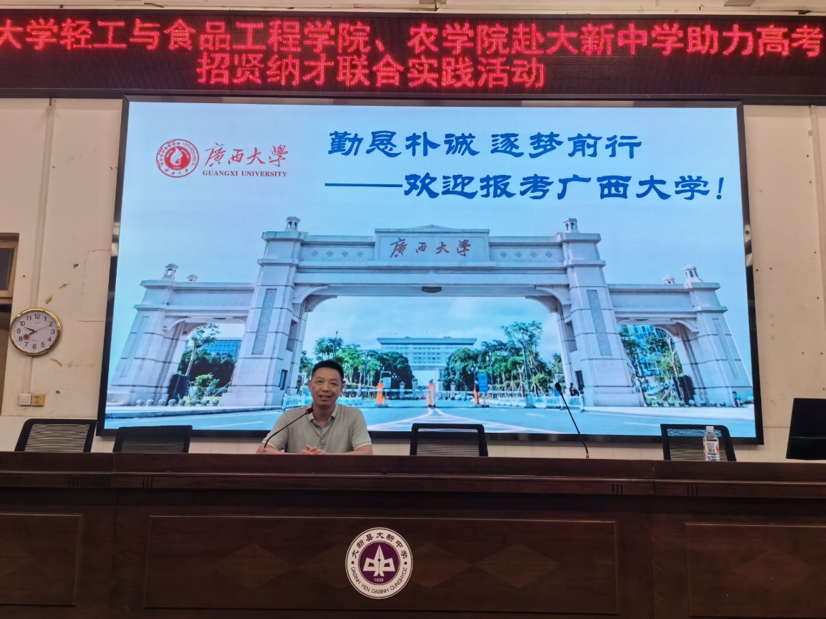 制糖工程系教师邓立高、学院团委书记徐羽、辅导员刘宇、曹羚彬和11名学生代表组成。大新中学黄永战副校长、高三班主任代表以及400名高三学子参加了宣讲会。