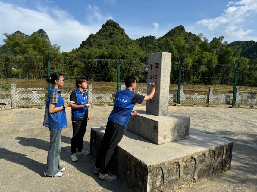 本次实践,实践团师生们前往位于大新县硕龙镇隘江村的中越边境河—归春江畔842号界碑段开展了巡边活动,并对界碑进行擦拭。界碑不仅是祖国边境的标志物,更代表着国家的形象和尊严,不容玷污。一尘不染的界碑象征着祖国强大的实力以及纯洁性,师生们精心擦拭着界碑,让界碑矗立蓝天之下,反射出耀眼的光芒,象征着东方大国用真诚和实力照亮世界的决心。