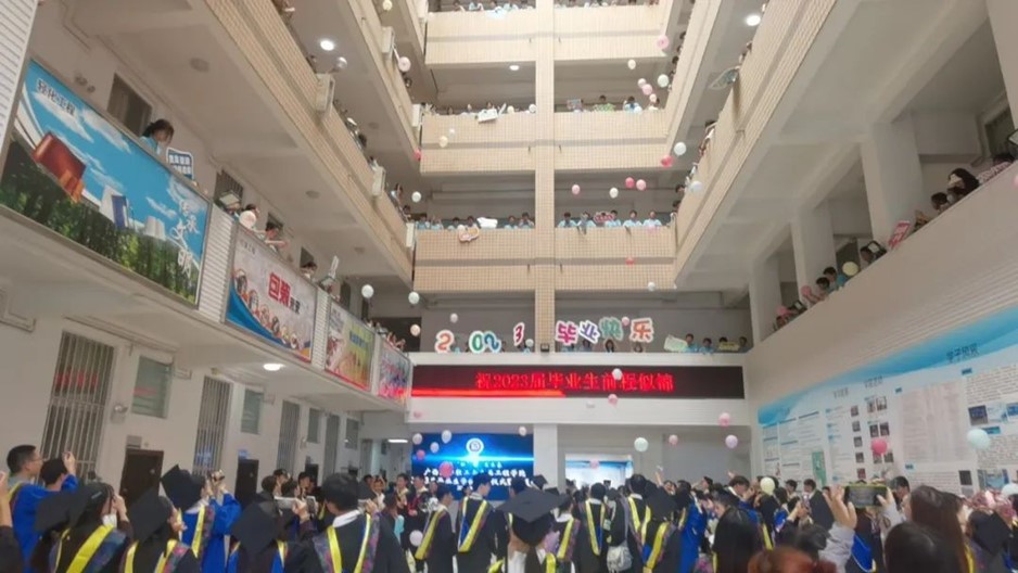 覃程荣与毕业生们温情道别。他说,学院留下了你们成长的轨迹,你们也见证了学院日新月异的发展变化,感谢你们对学院发展建设的支持和贡献!在你们当中,有88名同学选择继续深造,读研或者读博;大部分同学即将走向工作岗位。在这里,我们真心为大家感到骄傲和自豪!