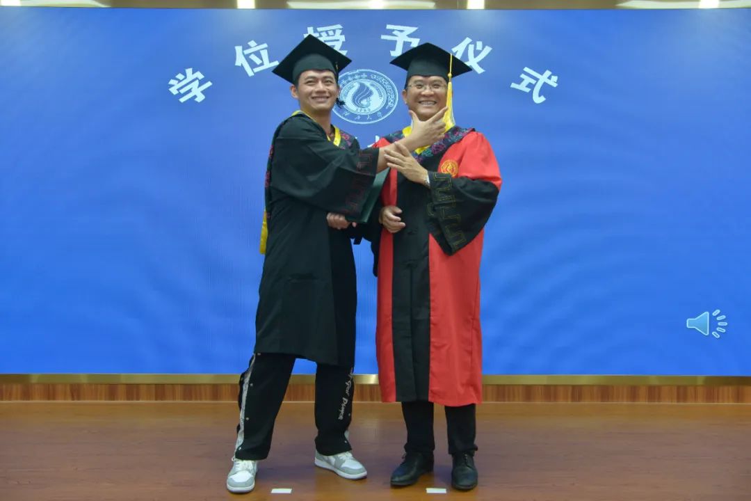 在欢庆的背景音乐声中,学院毕业生学位授予仪式拉开帷幕。覃程荣为成人动漫 2023届毕业生实施拨穗礼,并颁发学位证书。